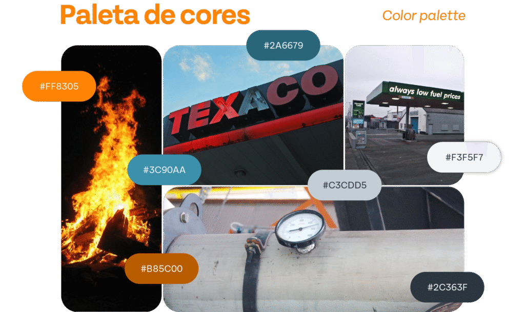 • Utilizar a paleta de cores (laranja, azul/teal e branco) de forma equilibrada para comunicar energia, acolhimento e segurança, elementos-chave para um posto de combustíveis.